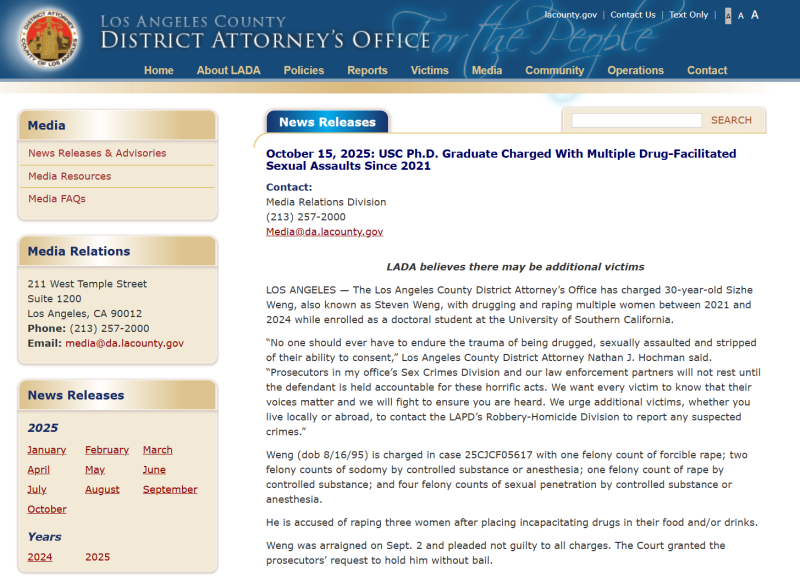 据称,这些犯罪发生在他2021年至2024年就读南加州大学研究生期间。Sizhe Weng拒不不认罪。