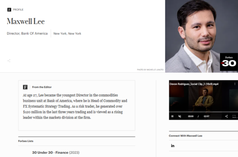 此前,他在美国银行Bank of America工作了近十年,于2023年、27岁时晋升为董事总经理(MD),并担任全球大宗商品投资产品负责人。当时他是美银大宗商品业务部最年轻董事总经理,亦是美银全球市场部门最年轻高管之一。