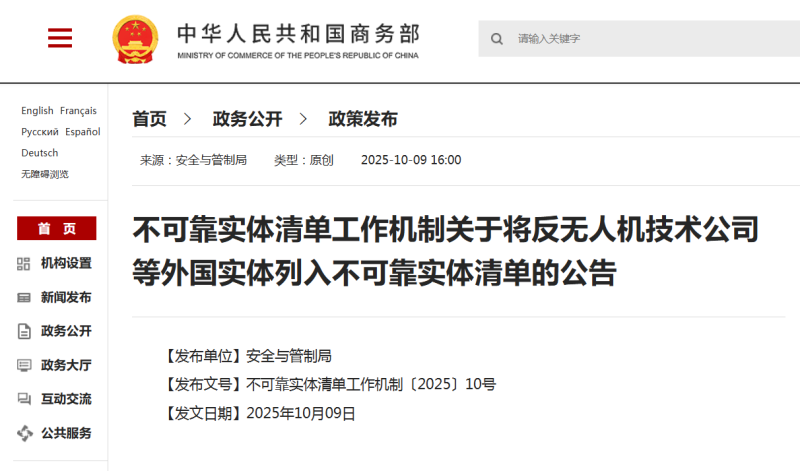 周四,中国商务部在一份声明中表示,将14家外国机构列入“不可靠实体名单”,限制其在中国开展商业活动的能力。