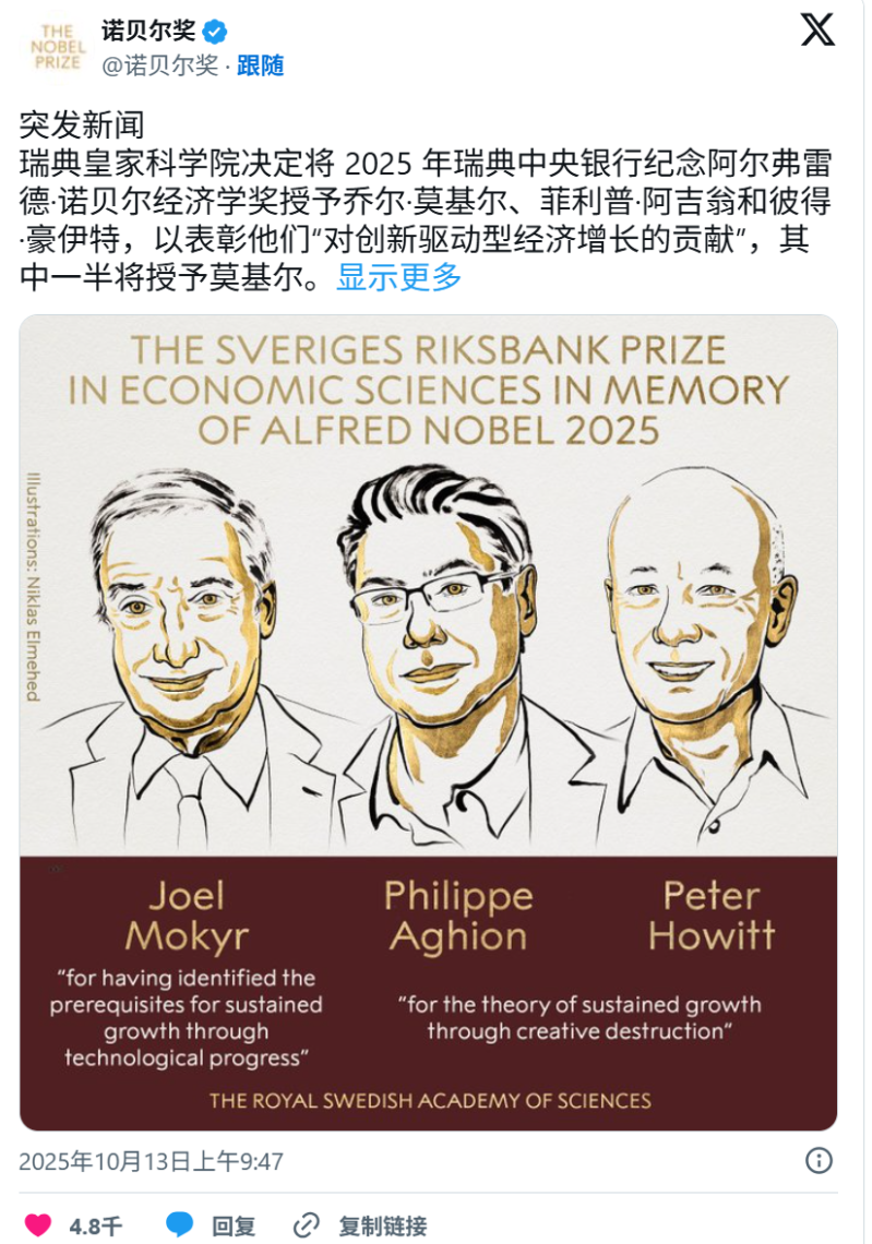 “获奖者的工作提醒我们,不应将进步视为理所当然,”隆德大学经济理论教授、奖项委员会成员克斯廷·恩弗洛告诉记者。“社会必须关注那些能够产生和维持经济增长的因素。这些因素包括基于科学的创新、创造性破坏以及乐于变革的社会。”
