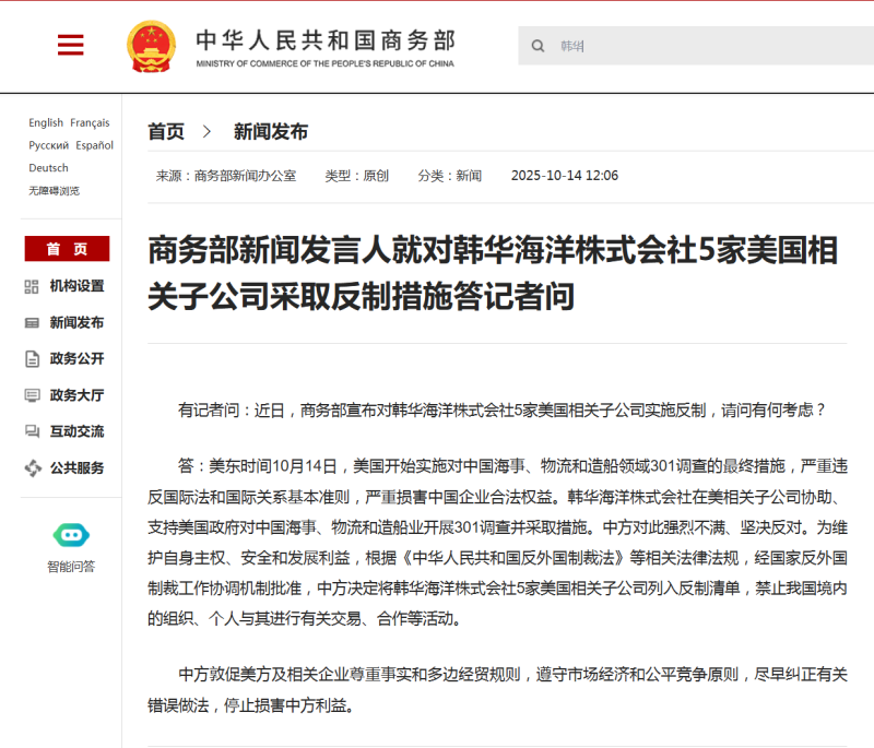 中国商务部周二宣布,将对韩国最大造船企业之一韩华海洋株式会社旗下五家美国实体实施限制。该公司股价在首尔证券交易所一度下跌8%,创下约两个月以来的最大跌幅。