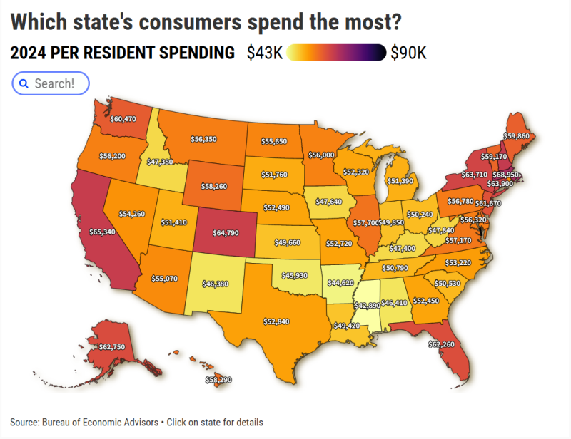 2024年,加州居民人均消费支出总计65,340美元,位居各州第四位,比全国平均水平56,700美元高出8,640美元。