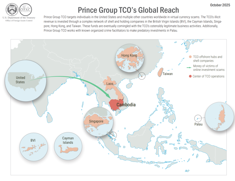 OFAC已对总部位于柬埔寨的太子集团跨国犯罪组织(Prince Group TCO)的146名成员实施全面制裁。该组织由柬埔寨公民陈志领导,通过针对美国及全球其他地区的在线投资诈骗。此外,FinCEN将总部位于柬埔寨的金融服务集团Huione Group与美国金融体系隔离。多年来,Huione Group一直为恶意网络攻击者洗白虚拟货币诈骗和盗窃的收益。