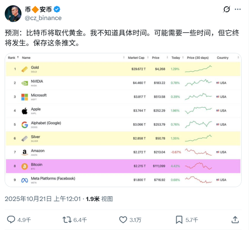 赵长鹏突然发声:比特币总市值将超过黄金