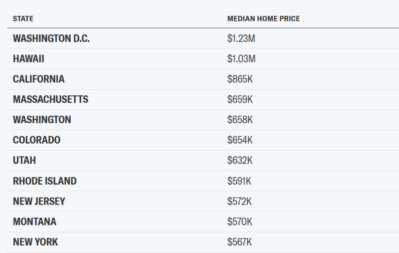虽然严格来说华盛顿特区不算一个州,但其房屋售价中值最高,其次是夏威夷州。加州居民的房屋价值也有望超过85万美元,几乎是全国房屋售价中值435,295美元的两倍。