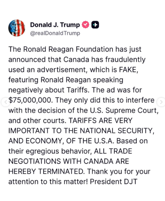 特朗普写道:“关税对美国的国家安全和经济至关重要。鉴于其恶劣行为,我们特此终止与加拿大的所有贸易谈判。”