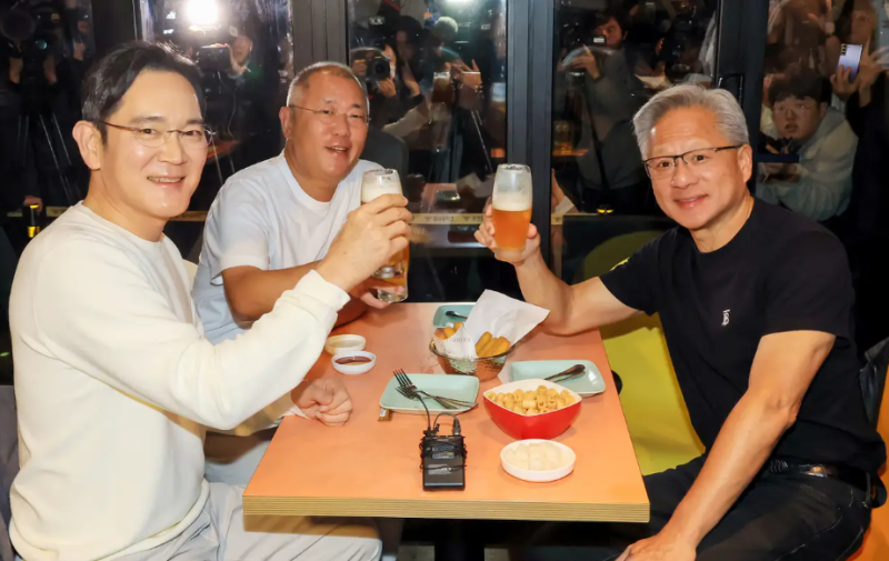 周四晚间,在韩国参加亚太经合组织首席执行官峰会期间,英伟达首席执行官黄仁勋与三星电子董事长李在镕、现代汽车执行董事长郑义宣在韩国首尔江南区一家名为Kkanbu Chicken(“干部炸鸡)的餐厅共饮啤酒。