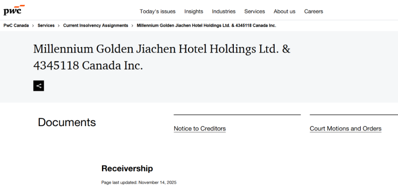 恒大集团旗下已破产的子公司千禧金嘉辰酒店控股有限公司(Millennium Golden Jiachen Hotel Holdings Ltd。)欠债权人5800万加元(约合4100万美元),其中包括欠德斯贾丁集团(Desjardins Group)旗下关联公司的1100万加元。根据法庭文件,这家加拿大贷款方已提交动议,要求出售该酒店。