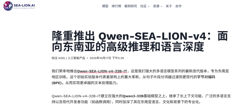 实际上,早在10月17日,Sea-Lion AI就已在博客上宣布了Qwen-Sea-Lion-v4的推出。