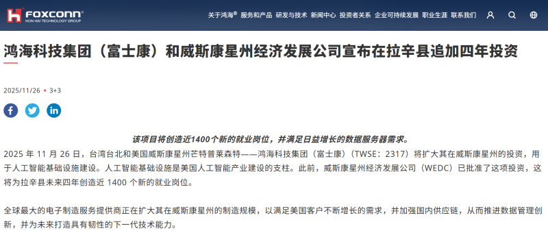 这项扩建计划已获威斯康星州经济发展公司董事会批准,预计将在拉辛县创造1374个新的就业岗位。这是富士康第二次修订其与州政府的激励协议,使其能够更好地满足美国日益增长的数据中心基础设施和人工智能相关硬件的需求。