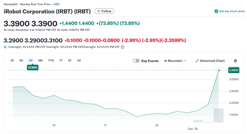 受此消息刺激,iRobot(IRBT)股价飙升,一度涨超79%,领涨机器人概念股。截至收盘,iRobot涨近74%,特斯拉涨近4.1%,Richtech Robotics (RR)涨18.5%,Serve Robotics(SERV)涨18.2%,WeRide(WRD)涨5.2%,Teradyne(TER)涨2.7%。