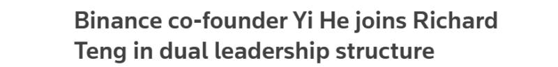 币安(Binance)公布,联合创始人何一(Yi He)正式出任联席首席执行官(Co-CEO)。