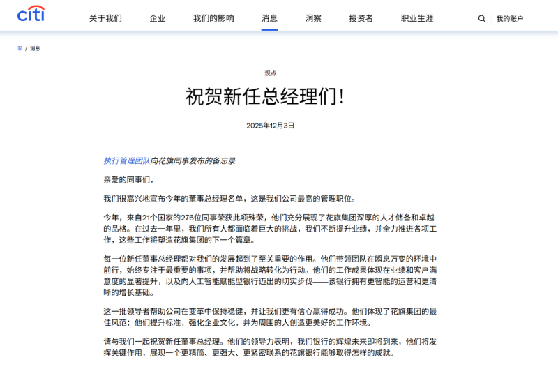 花旗276人晋升董事总经理!来自21个国家,规模五年来最小