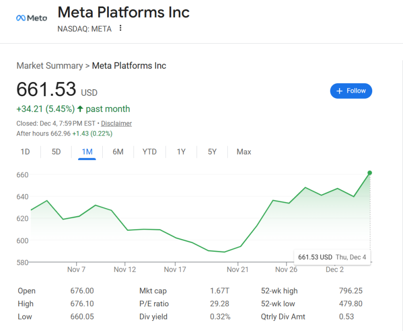消息传出后,纽约股市开盘后,Meta的股价一度飙升5.7%,收盘上涨3.43%,报661.53美元/股,总市值1.67万亿美元。