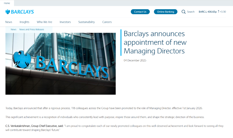 周四,巴克莱银行发布新闻稿,称全行有118名员工晋升为董事总经理(Managing Director)。