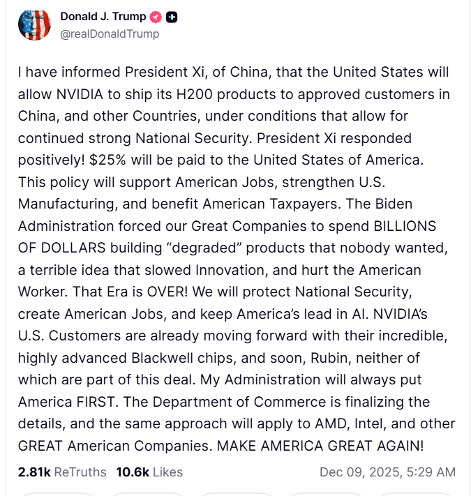 特朗普在帖子中补充道:“25%的收益将支付给美国”,这可能意味着英伟达从销售中获得的收入的25%将归美国政府所有,而此前达成的协议是英伟达向美国政府支付其对华芯片销售收入的15%。
