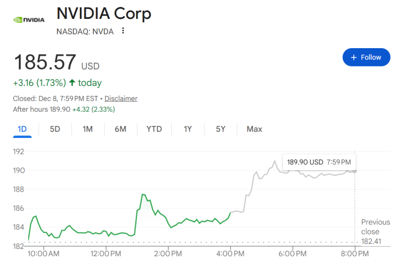 受此消息影响,英伟达盘中一度大涨近3%,最终收涨1.72%,报185.55美元/股,总市值4.51万亿美元。美股盘前交易时段,英伟达涨幅超过2%。