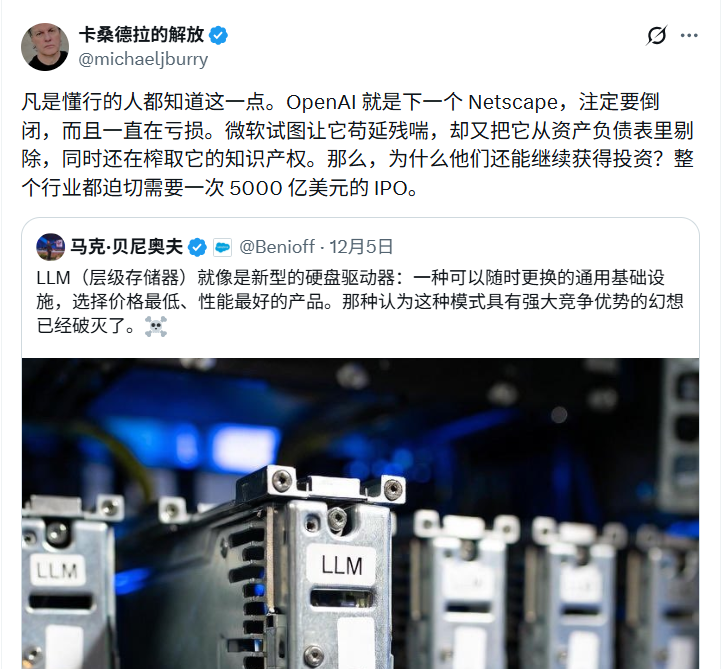 伯里表示:“OpenAI就是下一个Netscape,注定要倒闭,而且一直在亏损。”
