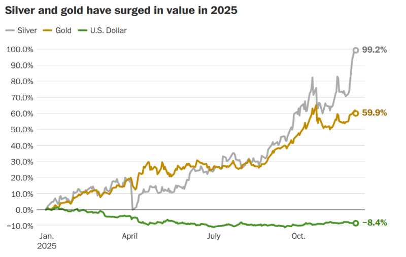 自年初以来,白银价格已翻了一倍多,并在周二创下新纪录,在纽约商品交易所首次突破每盎司60美元大关,周三仍在继续上涨。目前,白银价格预计在2025年将上涨102% ,远远超过黄金59%的涨幅。