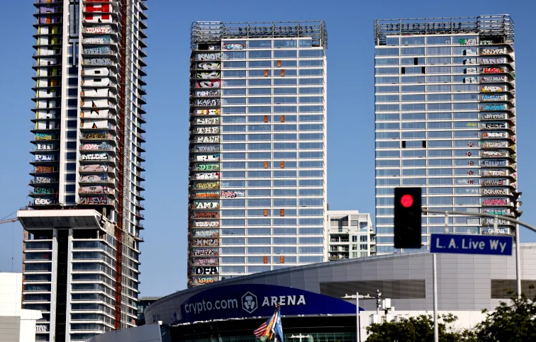 这座烂尾楼位于Crypto.com Arena(加密网竞技场)的街对面,该竞技场是NBA洛杉矶湖人队的主场。