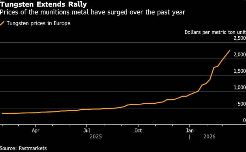 由于中国出口限制和不断增长的军用品需求上升,武器和半导体关键金属——钨——的价格达到历史新高,制造商正面临供应紧张的局面。